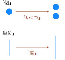 • 左辺の量(「もとにしている量」)は,自然数のときは「個」,それ以外の数のときは「単位」と意識されます。( 量測定)