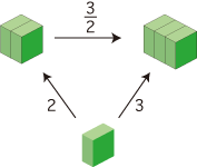 この長さをタテの長さとし,ヨコとタカサの長さが同じである直方体をとります。これによって,左右の直方体が 2 と 3 に共約されます: