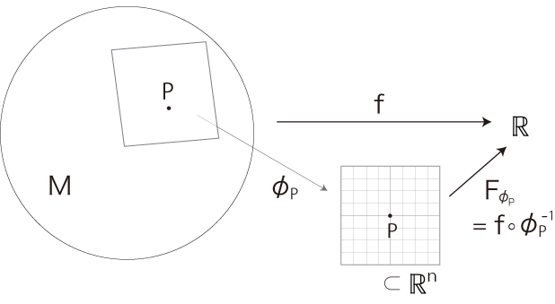 地図 \(\phi_P\) 上の \( {\bf x} = \phi_P(x)\) には,\(F_{\phi_P}\) によって \(f(x)\) が対応している。