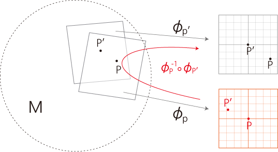 「曲線座標の地図」は,以下に述べる「地図 \( \phi_{P'}\) への地図 \( \phi_{P}\) の読み込み」である: