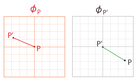 \(\phi_P' \) に \(\phi_P\) を,原点 (\(P'\)) が一致するように重ね,