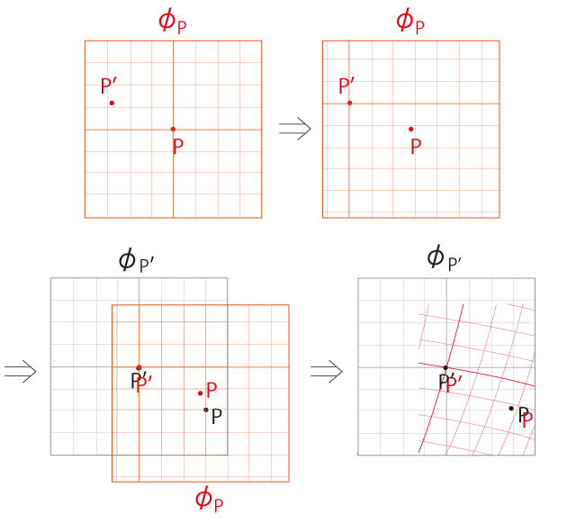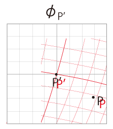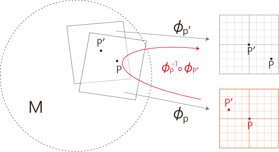 《点 \(P\) の地図 \(\phi_P\) を点 \(P'\) の地図 \(\phi_{P'}\) に読み込むと,