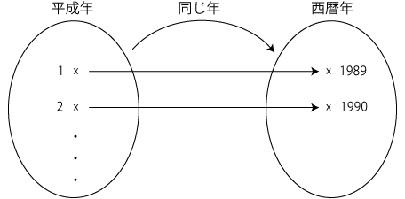 対応表に対し,対応し合う事項のカテゴリーと対応のきまりを,個々に明示的に取り出す。 このとき,「一意対応」が抽象される: