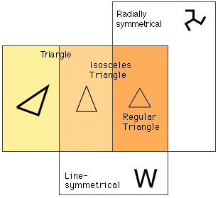 - ひとが対象化している三角形は,「二等辺三角形」,「正三角形」,「直角三角形」の3つですが,このうち「二等辺三角形」と「正三角形」は,「対称」を使ってつぎのように位置づけられます: