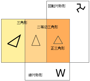 実際,ひとが対象化している三角形は「二等辺三角形」,「正三角形」,「直角三角形」の3つですが,このうち「二等辺三角形」と「正三角形」は,「対称」を使ってつぎのように位置づけられます:
