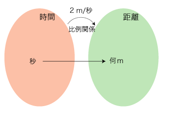 ここで,「速さの単位を時間,距離の単位に合わせる」とは,時間の単位 \( {\bf u}_t \) ,距離の単位 \( {\bf u}_d \) に対し,速さの単位を「\( {\bf u}_t \) 当たり \( {\bf u}_d \) ──比例関数 : 時間 → 距離であって,\( {\bf u}_t \) に \( {\bf u}_d \) が対応するもの──にとること。