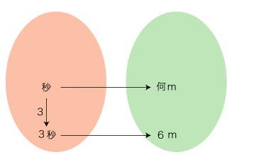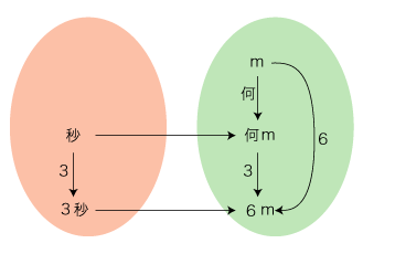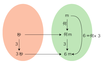 ──時間,距離,速さの単位を 秒,m,m/秒 とし,「3秒で6mは,何m/秒?」の場合を示す: