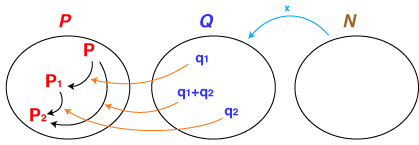 - 集合P,Q,Nは「作用」という関係でつながっています。すなわち,