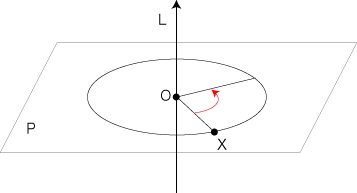 ユークリッド空間Sの1点Oと,Oを含む有向直線Lと,Oを含みLと垂直な超平面Pと,P上の点Xに対する,Oを回転の中心とするP上のXの回転。
