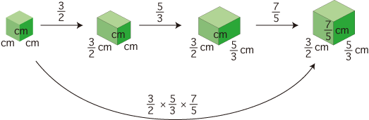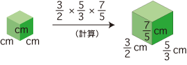 しかし,この直方体の体積は,「cm 立方の立方体の体積の (3/2 × 5/3 × 7/5) 倍」と求められます: