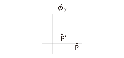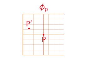 実際,「地図を接ぐ」は「座標の保持」の上に可能になることである。 地図を接ぐ旅は,座標を接ぐ旅である。 \(P'\) に着いたわたしは,地図 \(\phi_P'\) を作成する。 このとき \(\phi_P'\) のデカルト座標は,保持してきたデカルト座標の原点を \(P'\) に措いたものである。 \(P'\) は \(P\) から近い点を選んでいるので,\(\phi_P'\) には \(P\) が載ることになる。