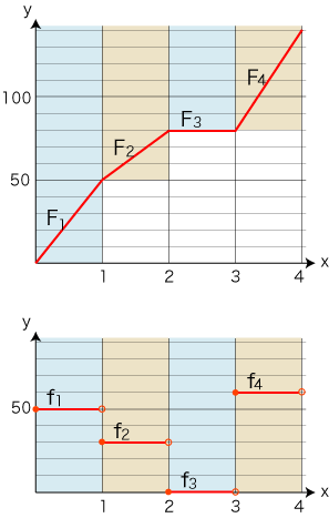 - グラフが折れ線の関数 F の導関数 f は,階段関数である。