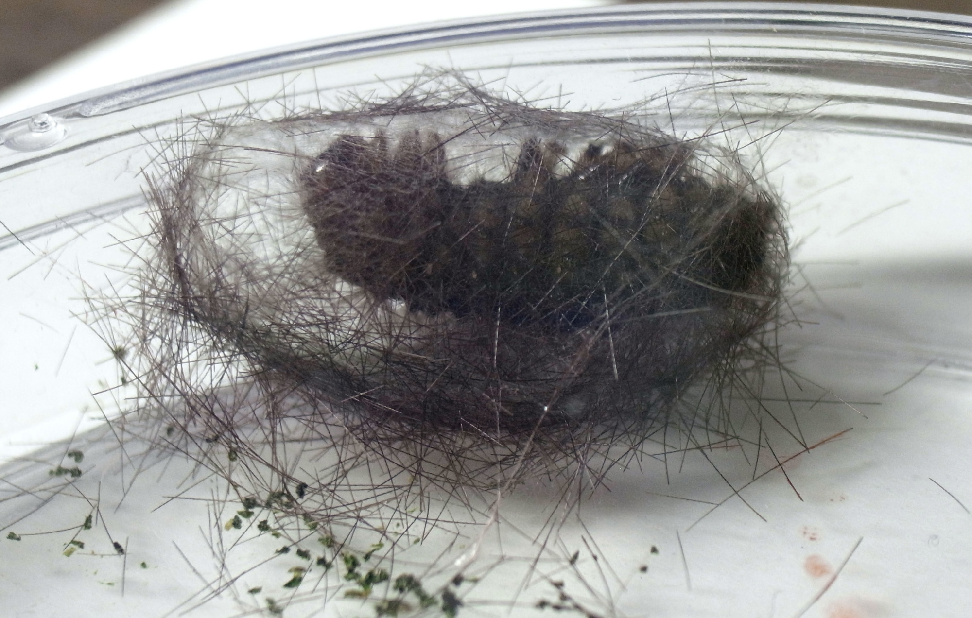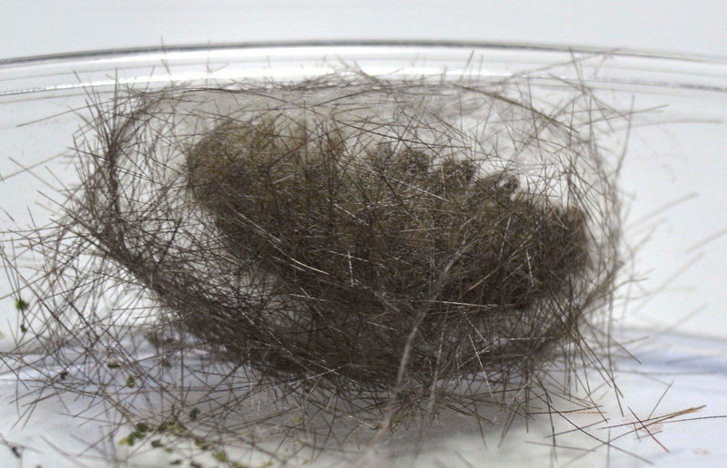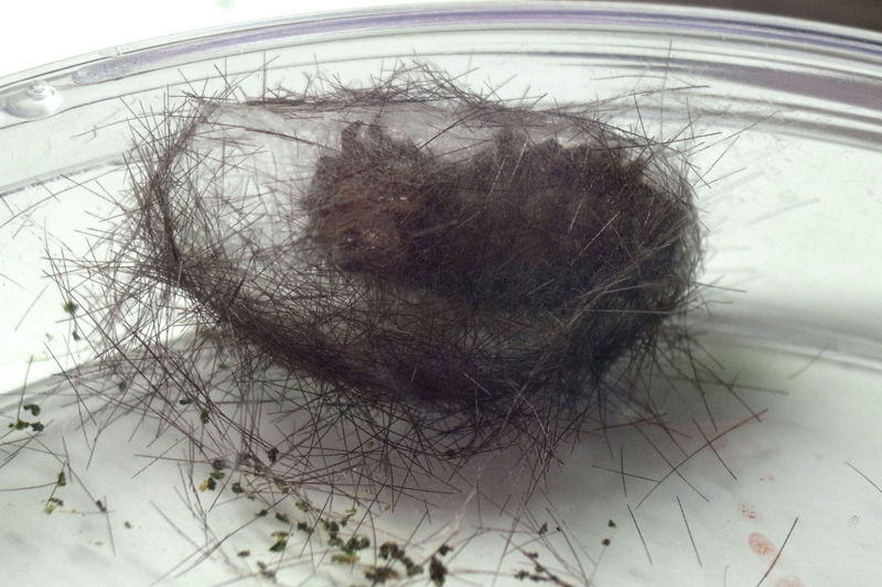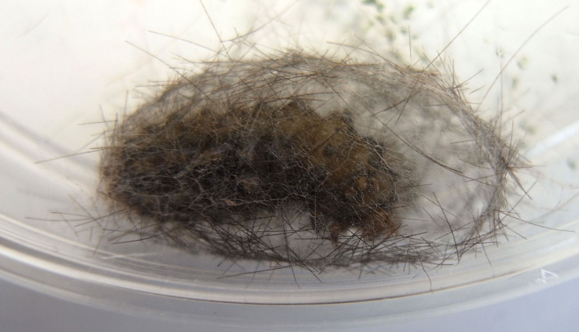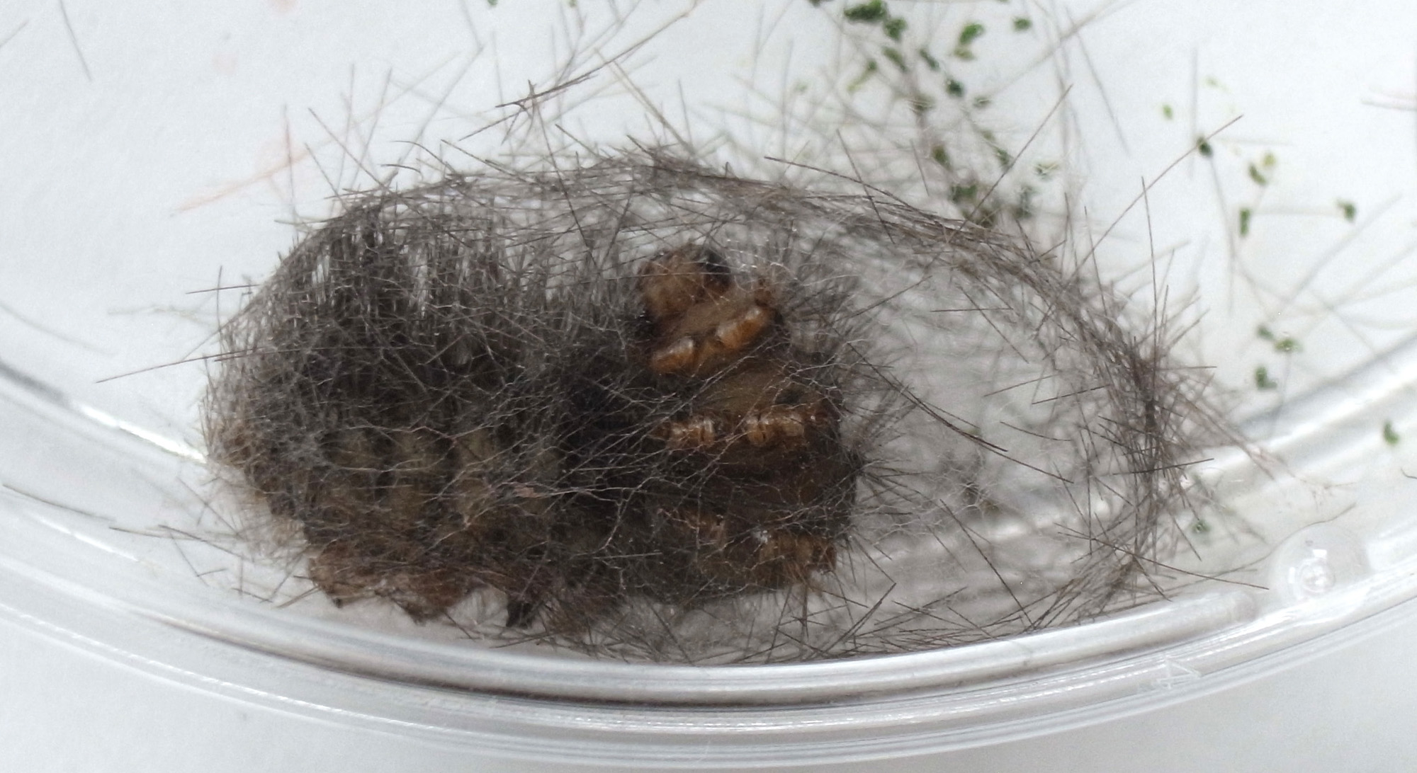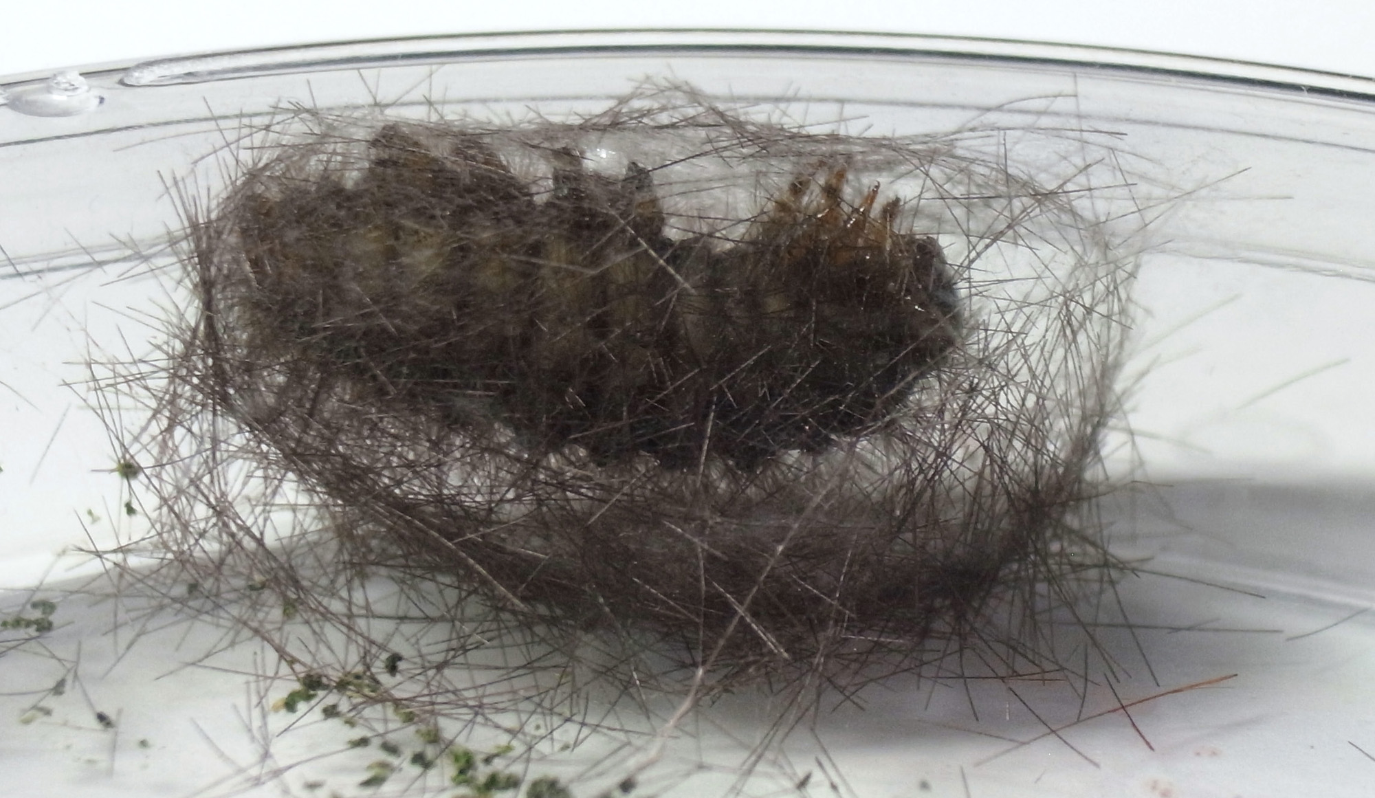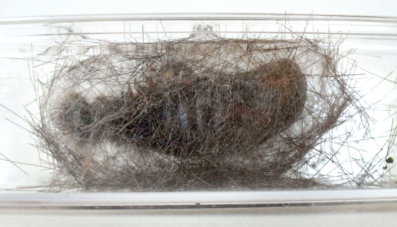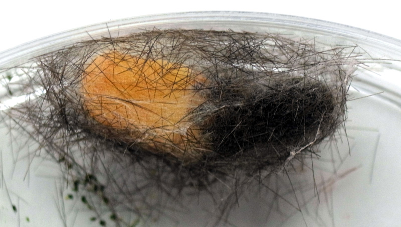 繭づくりでは,餌の葉も繭の材料にするらしい。 この度は,草の無いシャーレの中での繭づくりになる。 だいじょうぶか? 以下,繭の材料にする落毛の量も増えていく。 噛み切っているのか,抜いているのか,落とせるのか,わからず。 |