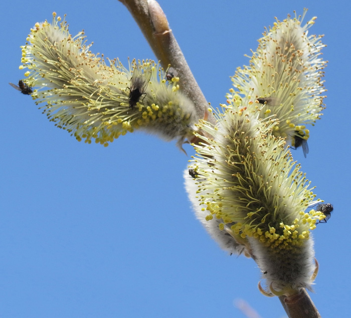 キヌヤナギの雄花の蜜を舐めている ( 雄花の蜜腺)