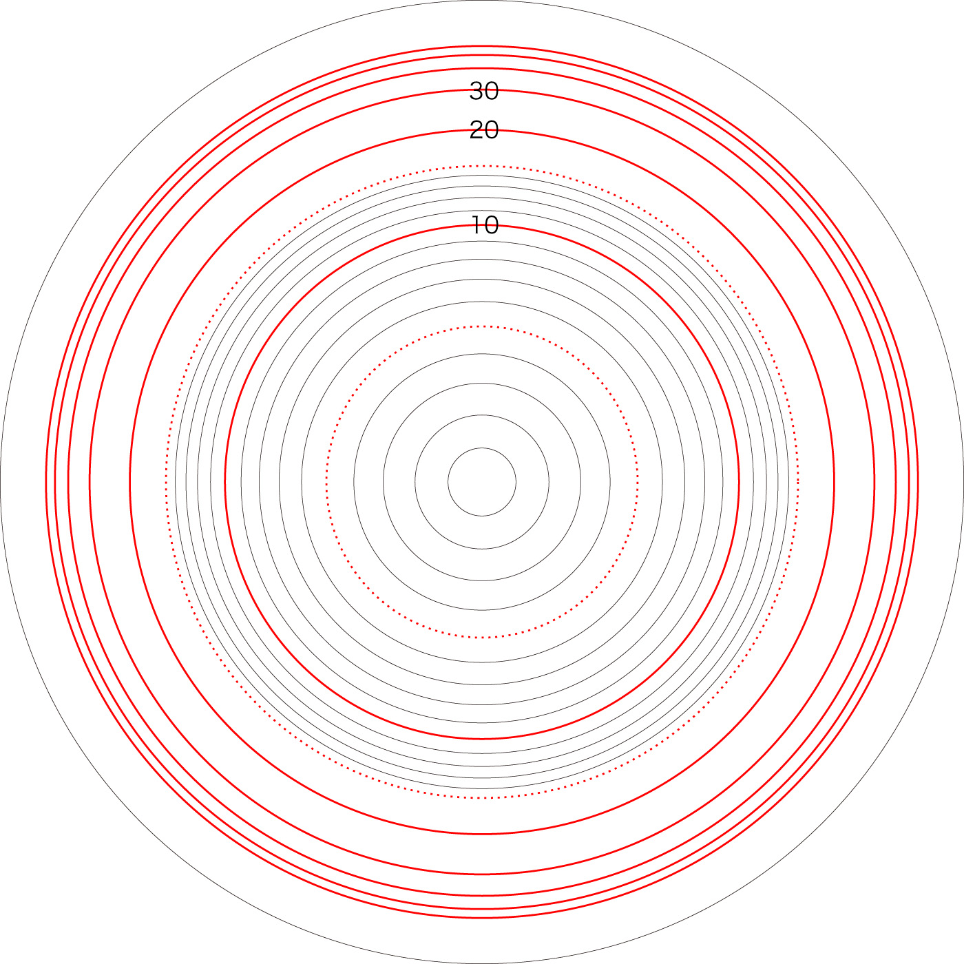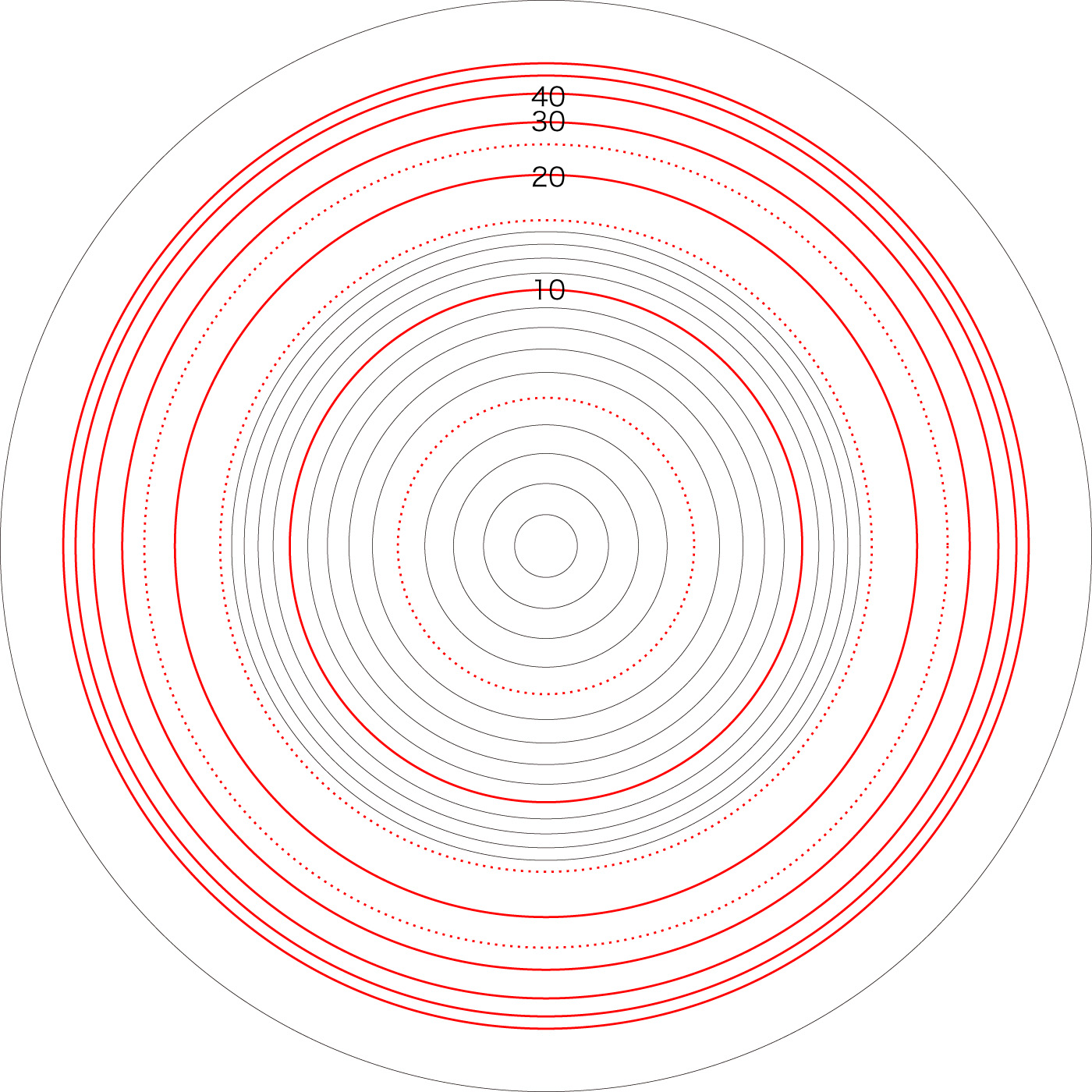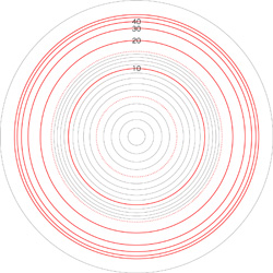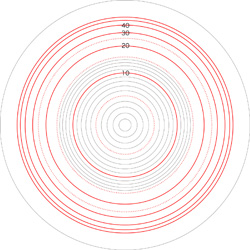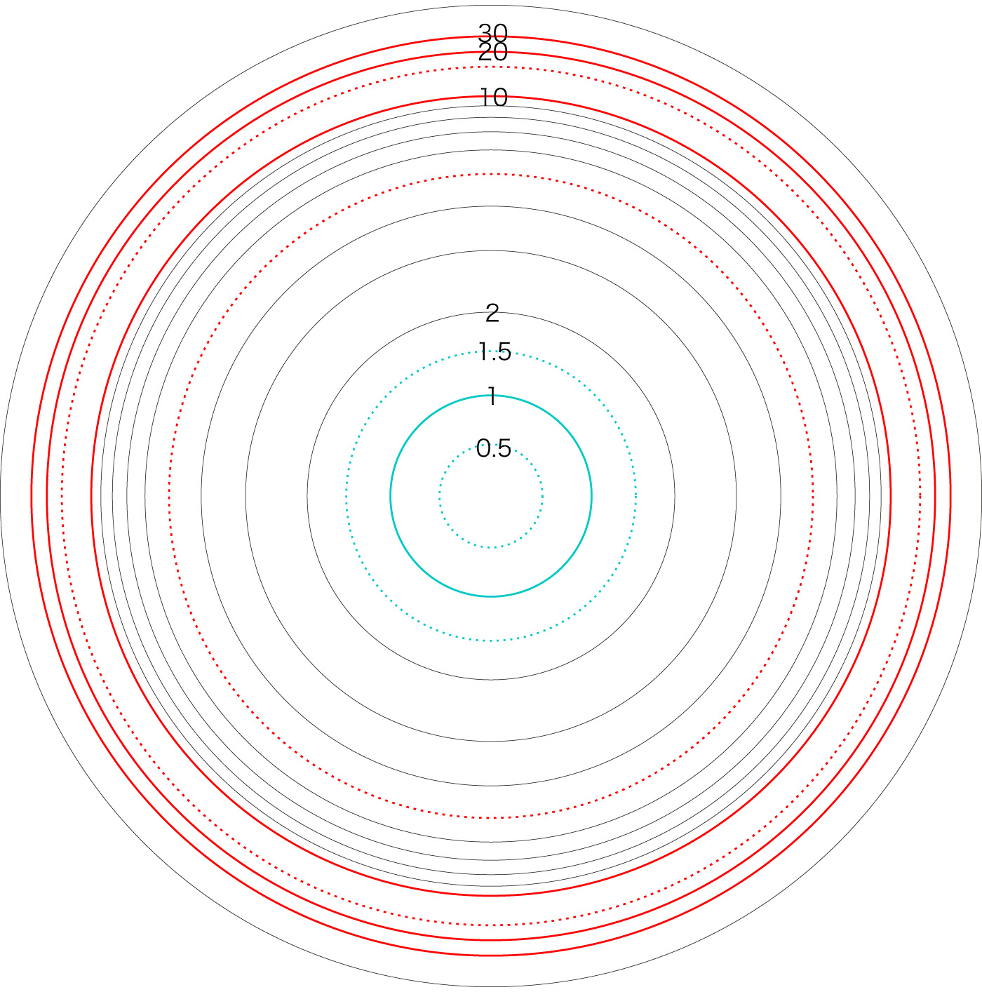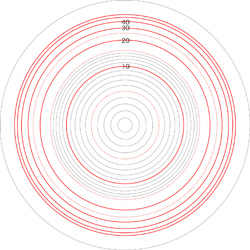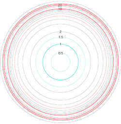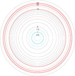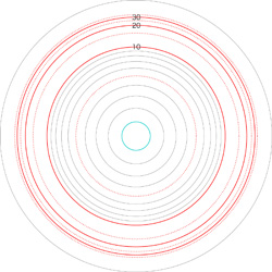 この関係により,高度\( h \) を固定したときの距離座標を作成することができる。 ここでは,高度1〜15 km まで1km おきに,距離座標を作成しておく。 これを適当に縮小/拡大し,レイアーとして撮影画像に重ねて使用する,というわけである。 |