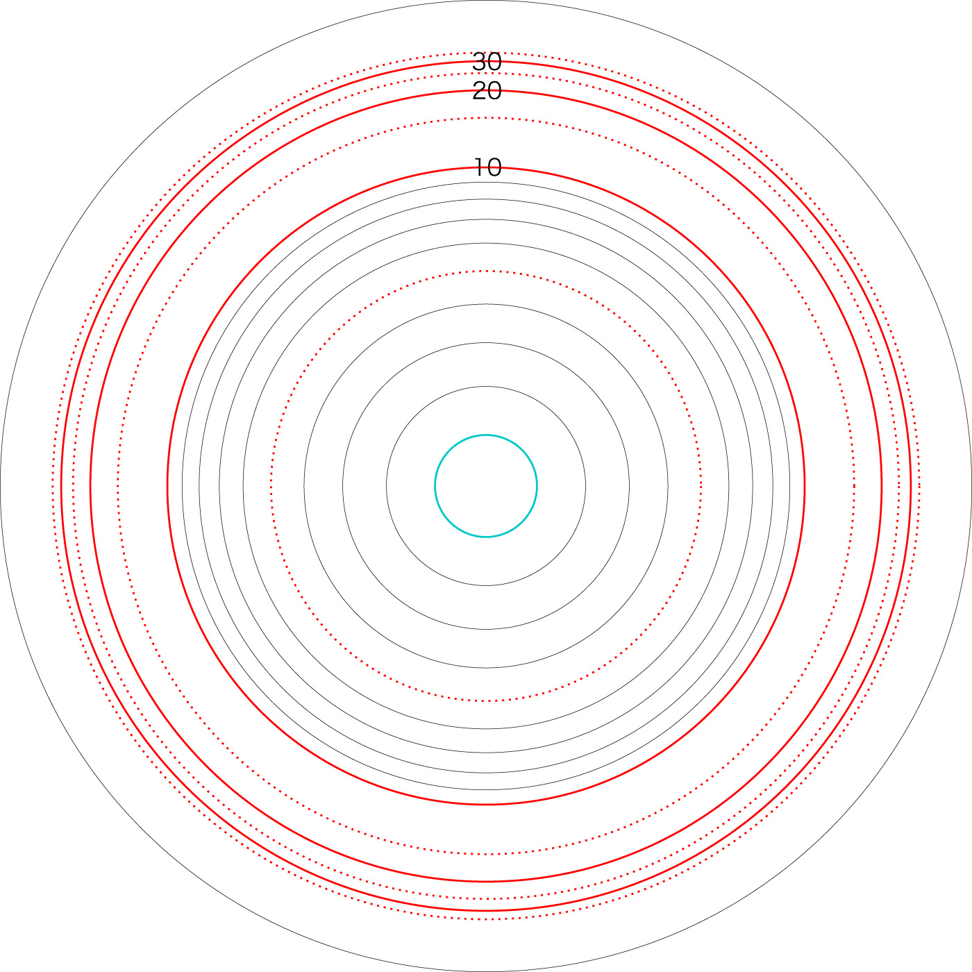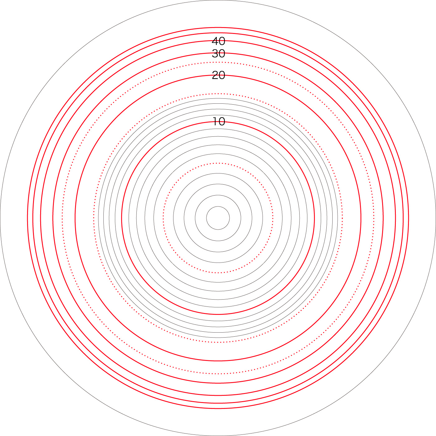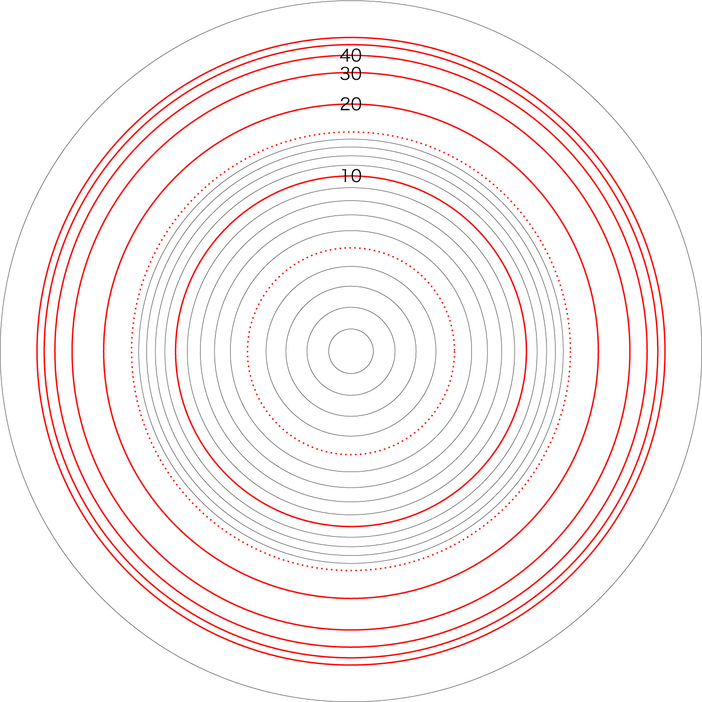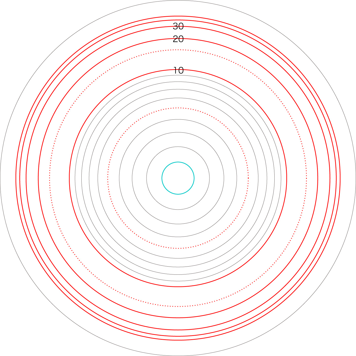 この関係により,高度\( h \) を固定したときの距離座標を作成することができる。 ここでは,高度1〜15 km まで1km おきに,距離座標を作成しておく。 これを適当に縮小/拡大し,レイアーとして撮影画像に重ねて使用する,というわけである。 |