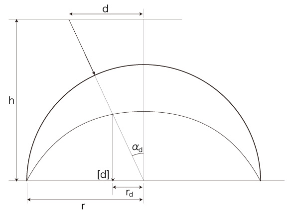 半球面の半径を \( r \) とする。 そして,角度 \( \alpha_d \) と長さ \( r_d \) を,つぎのように措く: