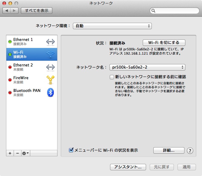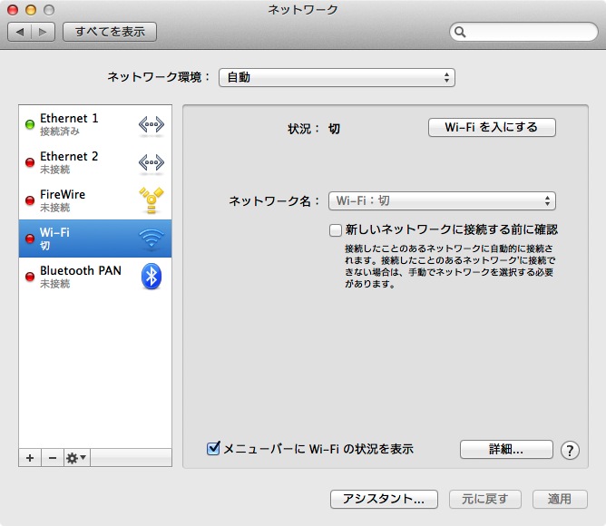 - システム環境設定の「ネットワーク」を開く。