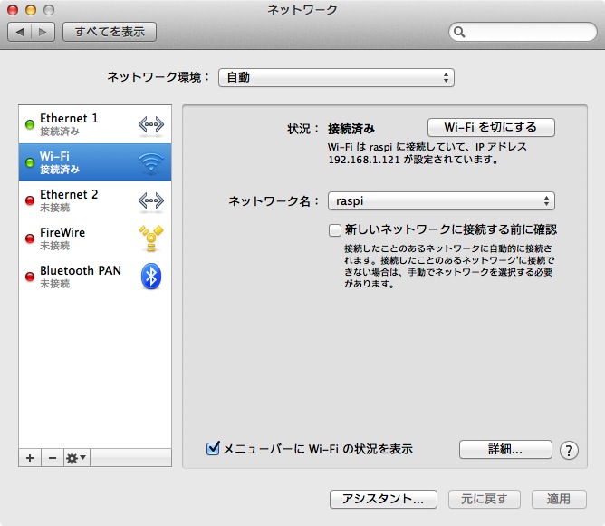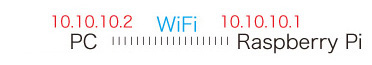 - これで,WiFi による PC (IP アドレス 10.10.10.2) と Raspberry Pi (IP アドレス 10.10.10.1) が可能になる。