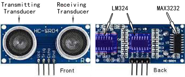 超音波センサー前面に、2つの目のような金属製の部品が付いています。これらはトランスデューサと言われるもので、機械的な力を電気信号に変換する変換機です。同センサーには、送信用と受信用の変換機があり、送信用は電気信号を超音波パルスに変換し、受信用は反射した超音波パルスを電気信号に変換します。