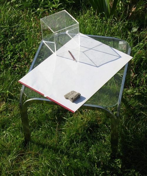 方法は,紙の上にアクリルの箱をのせ,直立した辺 (高さ 16 cm) の影の先端を,紙に鉛筆でマークしていくというもの: