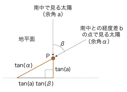 そこで,経度bに対する影の移動が,つぎの式で求まる: \[ tan(a) tan(\beta) \]