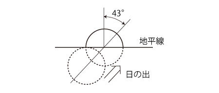 札幌は北緯43度。 そして,つぎの移動にかかる時間は,1.07分の 1.4倍 ( ≒ 1.5 分) ほど: ![]() ということで, 「日の出・日の入の太陽は地平線の下」の条件で加算される時間は