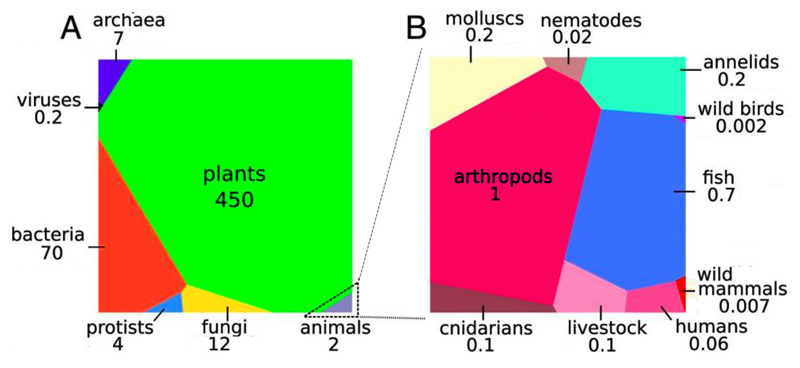 ちなみに、生物体における炭素の質量で見積もった場合、生物の総重量は約550ギガトン (1ギガトンは10億トン) で、そのうち植物は約450ギガトン、細菌は約70ギガトン、動物は 約2ギガトンだ。