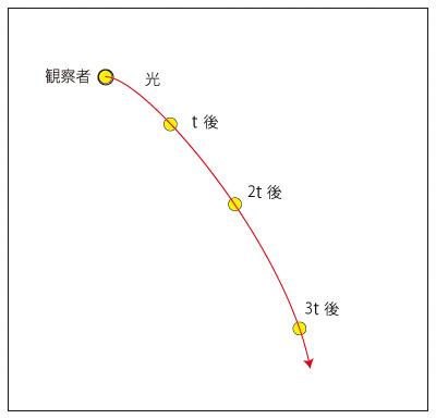そして,その質点にいる観察者には,光が重力に引かれて曲げられているように見える: