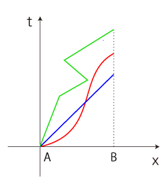 方法の得は,失と表裏である。 この方法の難点は,記述から動きの像を起こすのが難しいことである。 動きをイメージするのが難しい。 動きの視覚的イメージ──即ち,絵──が欲しくなる。 動きがわかる絵。 こうして,空間と直交する時間軸を立てた絵の登場となる。 ただしこの絵は,3次元を模した描画のうちの1次元分を時間軸に譲ることになるので,空間は2次元 (平面) ないし1次元 (直線) に抽象されることになる。 この画法は,直線上の移動に対しては十全なものになる。 A点からB点への移動のいろいろが,互いに違って描かれることになる: