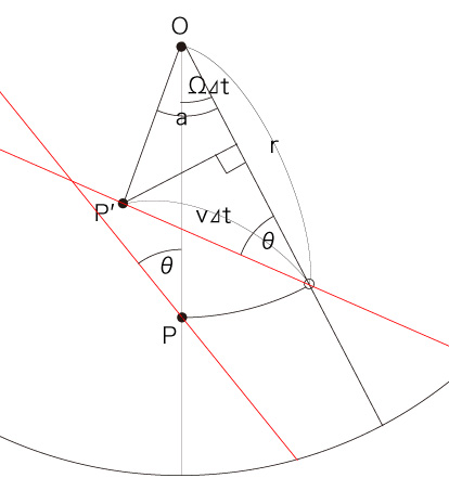 ![]() \( \overline{ OP'} \) は, \[ \overline{ OP'}^2 \\ = ( r - v\ \Delta t\ cos( \theta ) )^2 \\ \quad + ( v\ \Delta t\ sin( \theta ) )^2 \\ = r^2 - 2\ r\ v\ \Delta t\ cos( \theta ) + v^2 \Delta t^2\ cos( \theta )^2 \\ \quad + v^2 \Delta t^2\ sin( \theta )^2 \\ = r^2 - 2\ r\ v\ \Delta t\ cos( \theta ) + v^2 \Delta t^2 \\ \] よって, \[ \frac{\overline{ OP'}^2 - r^2 }{ \Delta t} \\ = - 2 r v\ cos( \theta ) + v^2 \Delta t \ \\ \ \\ \longrightarrow \ - 2 r v\ cos( \theta ) + 0 = - 2 r v\ cos( \theta ) \ \ ( \Delta t \longrightarrow 0 ) \\ \ \\ \ \\ \frac{\overline{ OP'} - r }{ \Delta t} \\ = \frac{\overline{ OP'}^2 - r^2 }{ \Delta t} \ \ \frac{ 1 }{\overline{ OP'} + r } \ \\ \ \\ \longrightarrow \ ( - 2 r v\ cos( \theta ) )\ \frac{1}{ 2\ r } = - v\ cos( \theta ) \ \ ( \Delta t \longrightarrow 0 ) \] また, \[ \frac{ 1 - cos( a ) }{\Delta t } \\ \ \\ = \frac{1}{ \Delta t } \frac{ \overline{ OP'} - \overline{ OP'} cos( a ) }{ \overline{ OP'} } \\ \ \\ = \frac{1}{\overline{ OP'} \Delta t } \bigl( \overline{ OP'} - ( r - v \Delta t cos( \theta ) ) \bigr) \\ \ \\ = \frac{1}{\overline{ OP'}} \bigl( \frac{ \overline{ OP'} - r }{\Delta t} + v cos( \theta ) \bigr) \\ \ \\ \longrightarrow \ \frac{ 1 }{ r }\ ( - v\ cos( \theta ) + v cos( \theta ) ) = 0 \ \ ( \Delta t \longrightarrow 0 ) \] \[ \frac{ sin( a ) }{\Delta t } \\ \ \\ = \frac{1}{ \Delta t }\ \frac{ \overline{ OP'}\ sin( a ) }{ \overline{ OP'} } \\ \ \\ = \frac{1}{\overline{ OP'} \Delta t }\ v\ \Delta t\ sin(\theta) \\ \ \\ \longrightarrow \ \frac{ v\ sin(\theta) }{r} \ \ \ \ ( \Delta t \longrightarrow 0 ) \] |