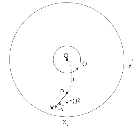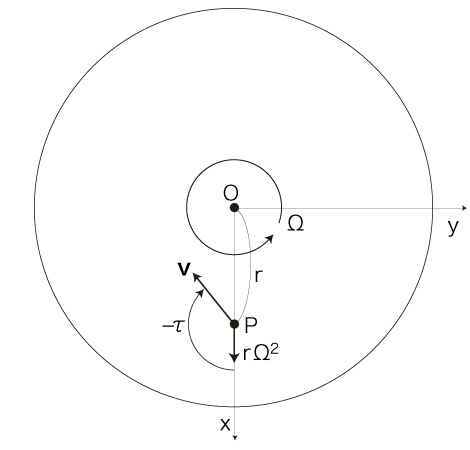 なお,自転球体上の移動がカオスになったように,自転円板上の移動──距離 \( r \) と速度 \( \bf{v} \) と加速度 \( r\ \Omega \) の相互フィードバック──も,カオスになりそうに思える。