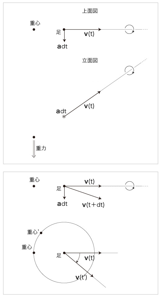 この図は,重心の位置が変われば円運動の方向が変わることを示唆する。