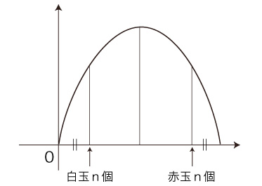 そして,<箱左半分の白玉の個数 : 0〜全部>と<箱右半分の赤玉の個数 : 0〜全部>が対称なので,グラフは対称になる: