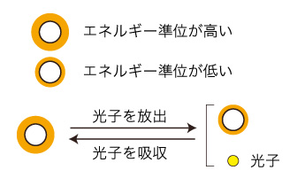 これは,物体の温度の形式的定義である。 即ち,「物体の温度は,形式化すればこういうものである」を述べた。 では,物体の温度は,どう見たら,この「温度」になるか? 以下のように見る。 物体の粒子に対し,「励起状態」とか「エネルギー状態」を想う。 ──意味不明だが,ここは目をつぶる。 一般に,物体の粒子は,それぞれの励起状態が同じではない。 この「励起度の凸凹」に,「分布」「乱雑さ」を適用する。 即ち,「粒子間で励起度の凸凹が大きい」が,「分布の偏りが大きい」であり,「乱雑さが小さい」である。 励起度が違う粒子間には,光子のやり取りが現れる: