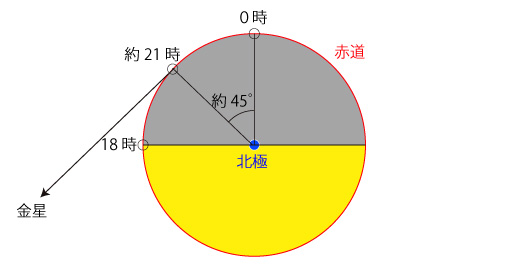 同様に,赤道上で地平線に最も遅い時刻に沈む金星を見るとき,その時刻は約21時: