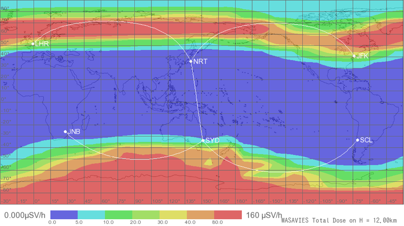 太陽放射線被ばく警報システム (WASAVIES) で計算された、大規模フレア時の宇宙放射線による被ばく線量分布