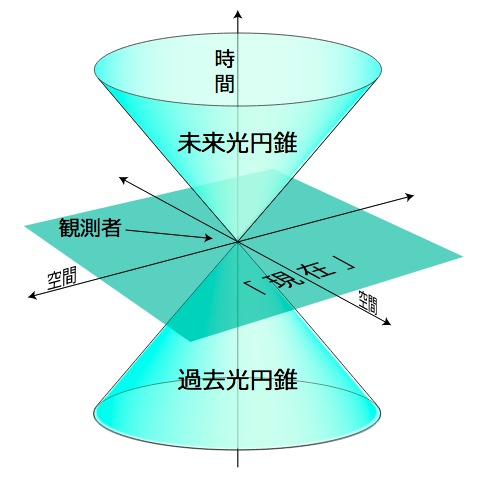 実際,「いま・ここ」に届いている光を発した物質は曾てこの円錐面上に存在したものであり,曾てこの円錐面上に存在した物質が「いま・ここ」から見えている。