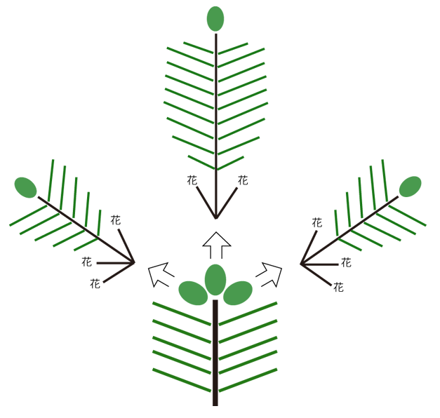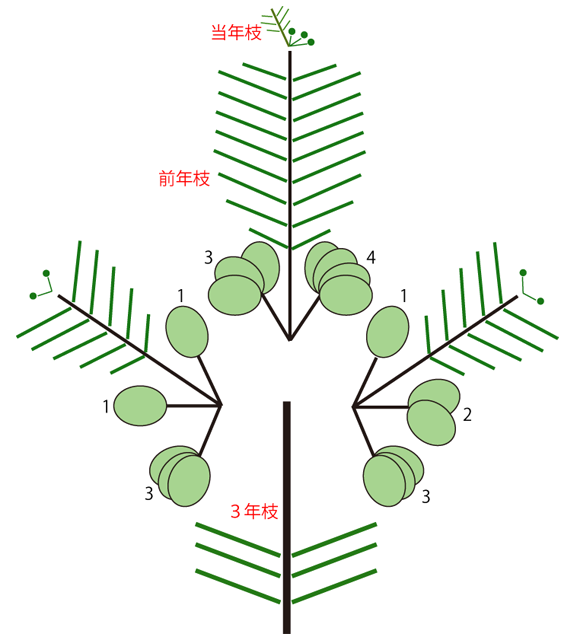 花芽と葉芽が別々なら,3年枝が当年枝だったとき,その先端には 3+4+4=11 個の冬芽がついていたことになる。