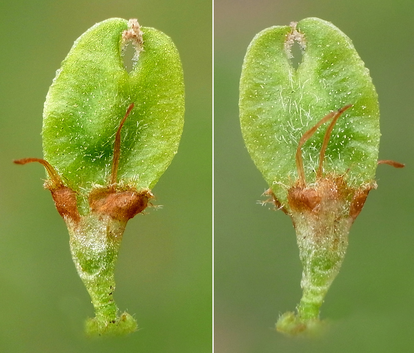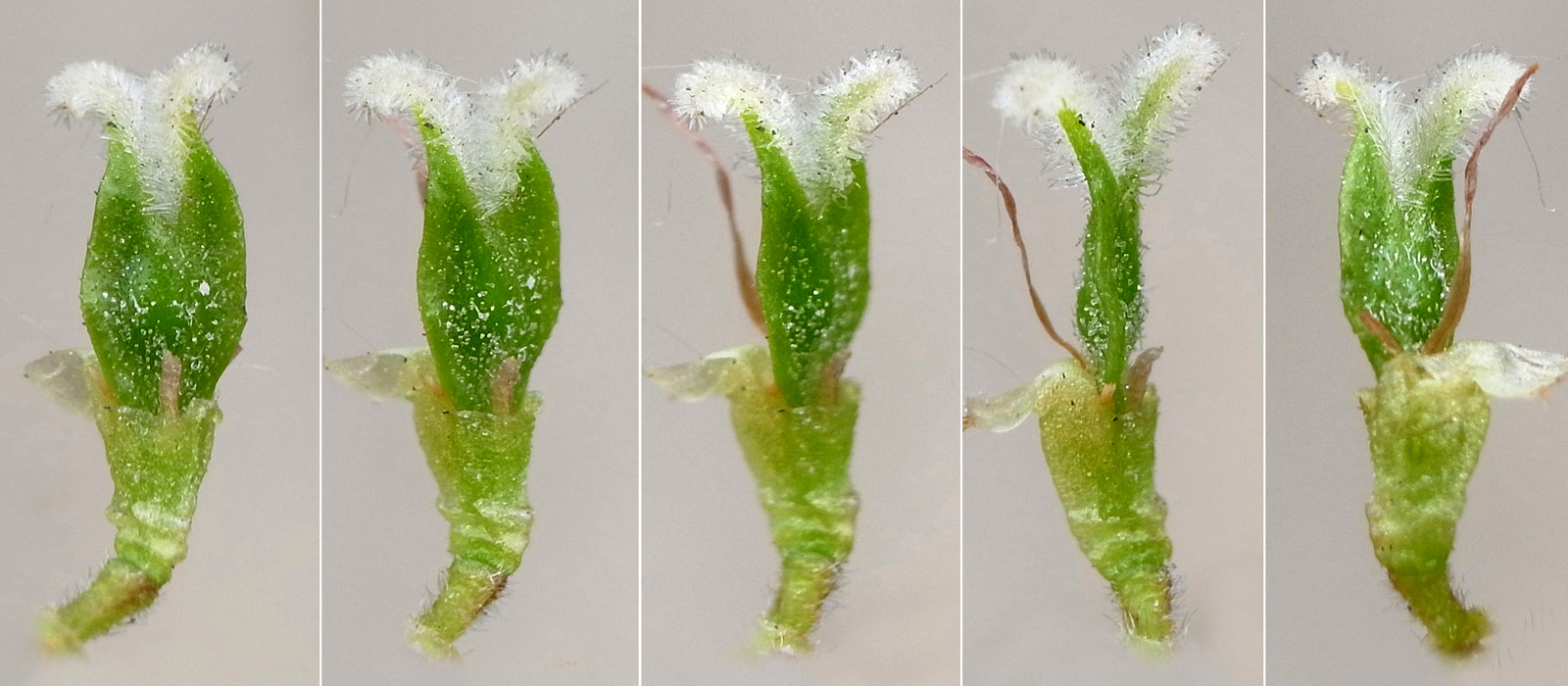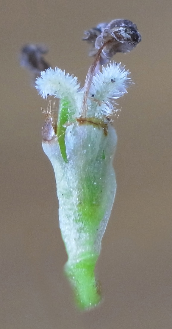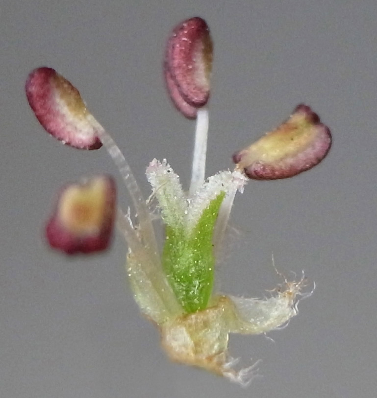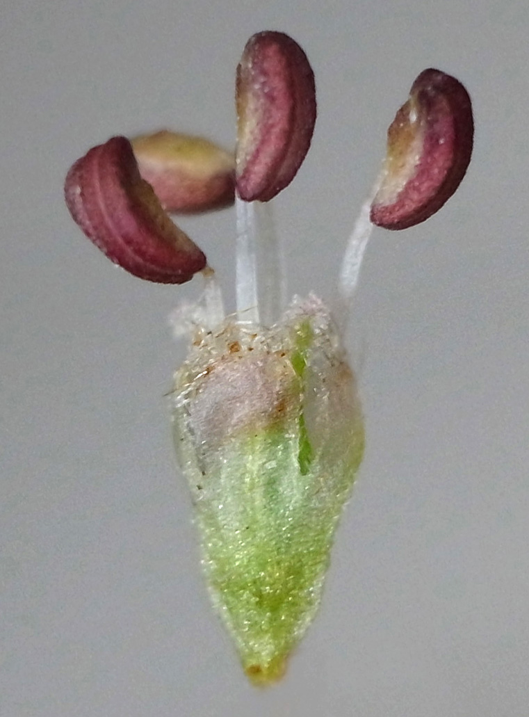 苞を開くと,花柱が2裂した雌しべが見える