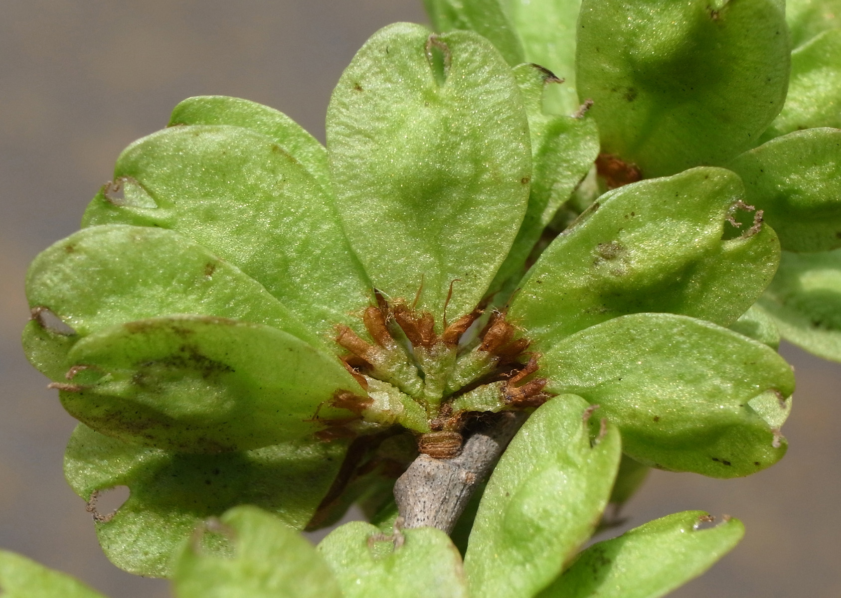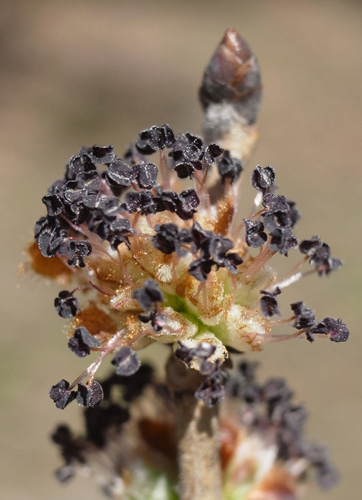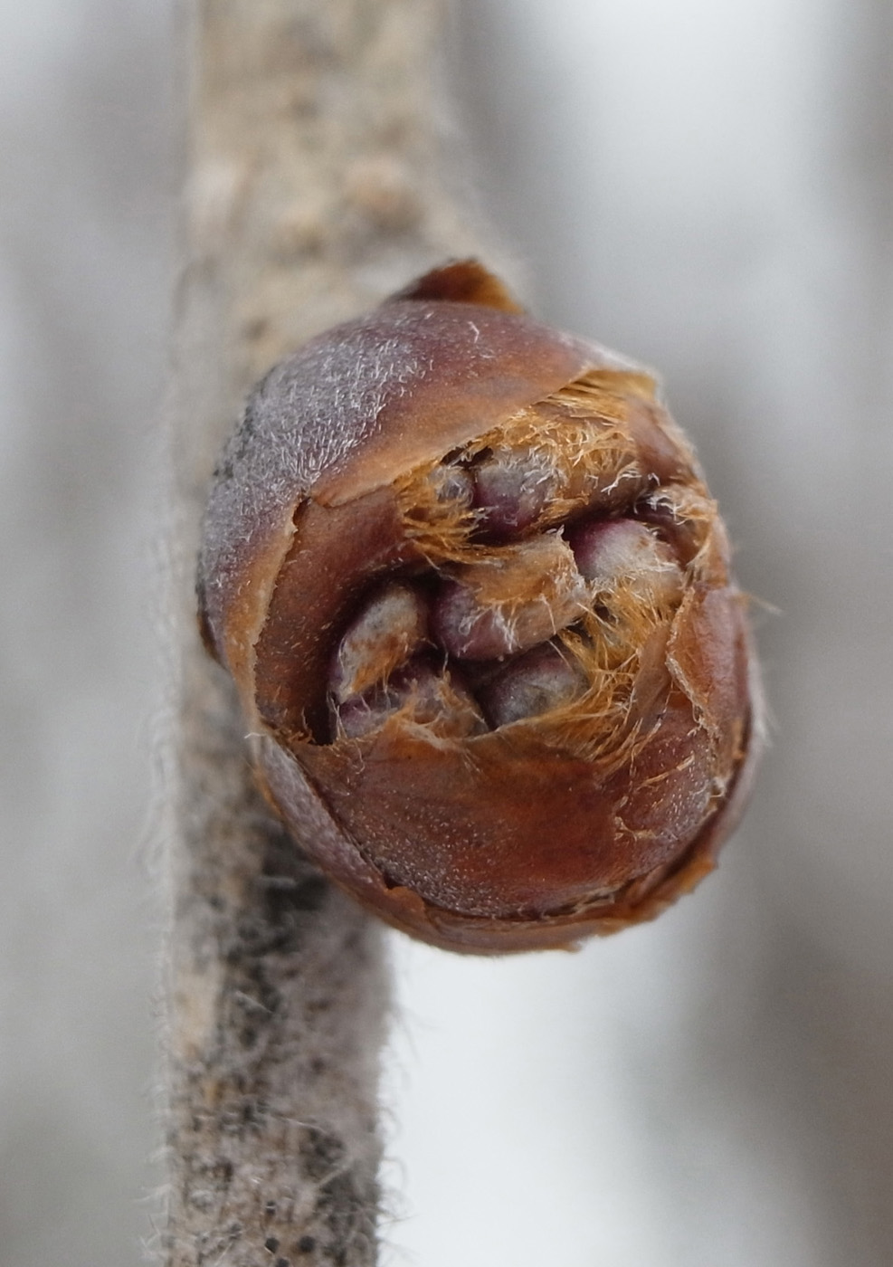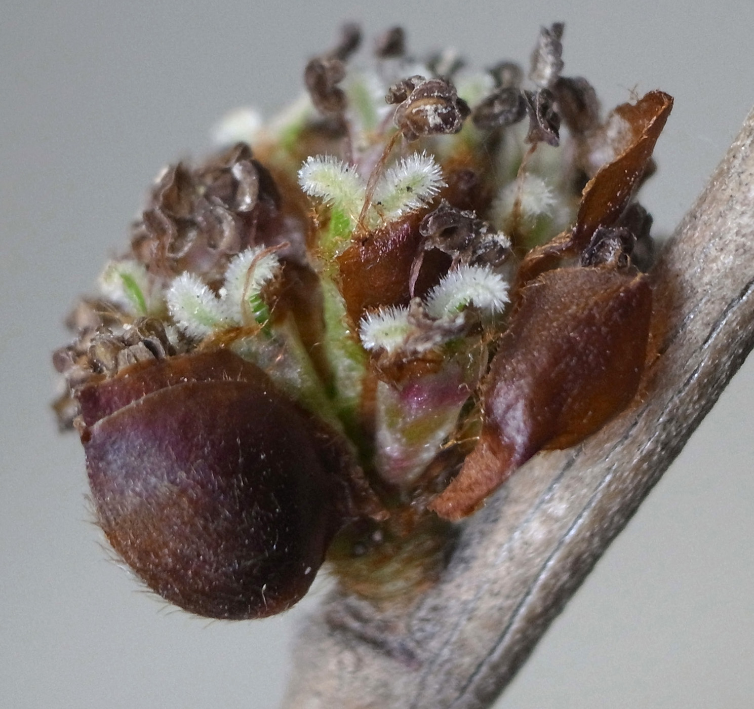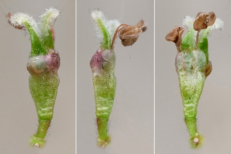 苞を開くと,花柱が2裂した雌しべが見える