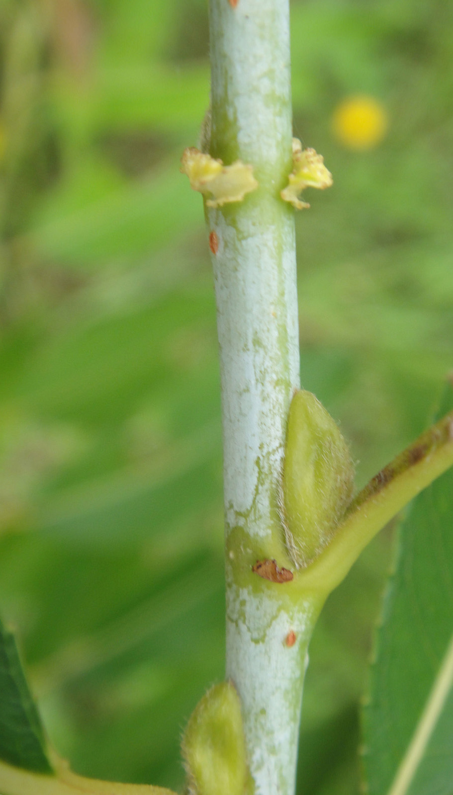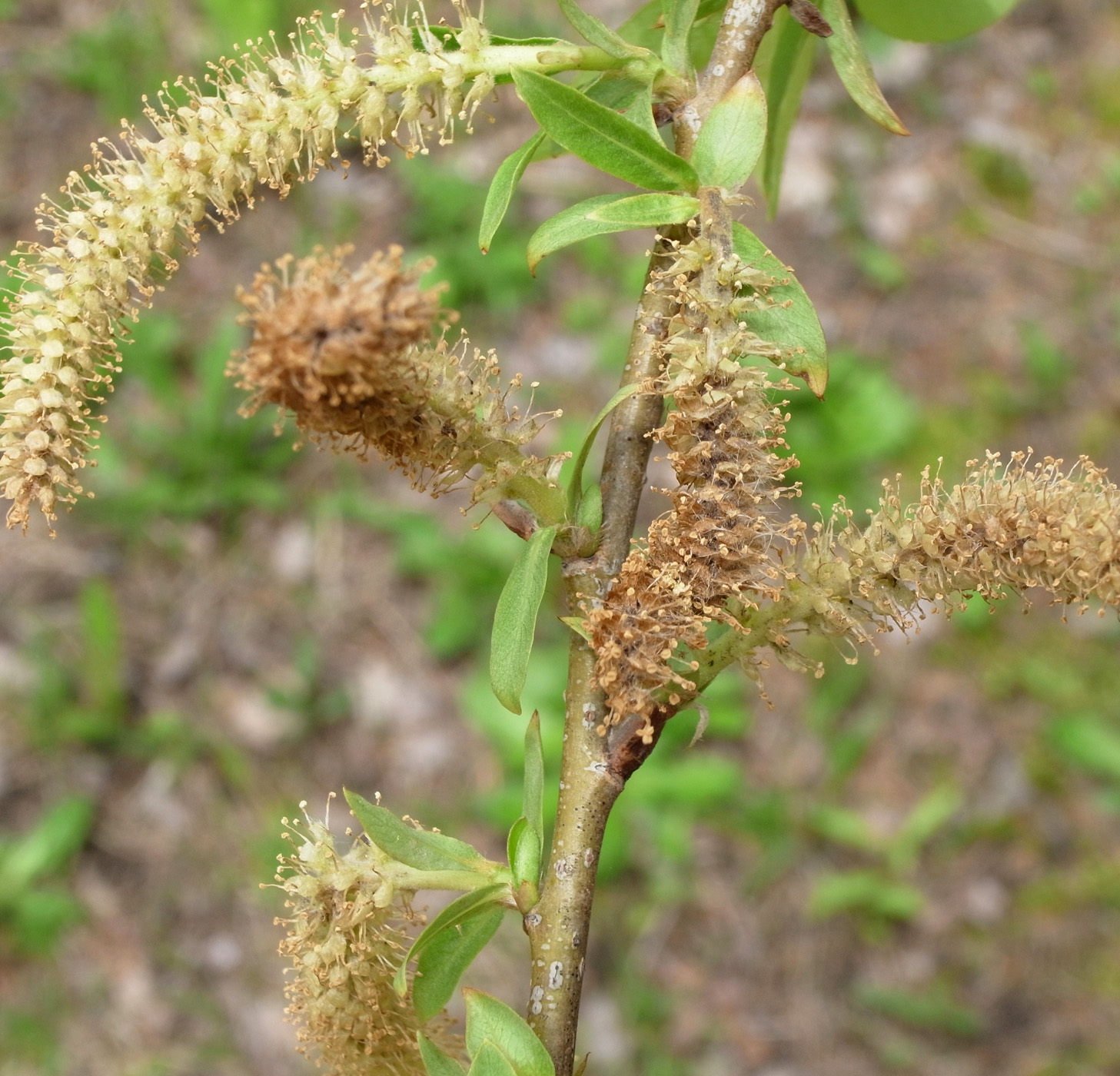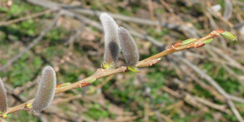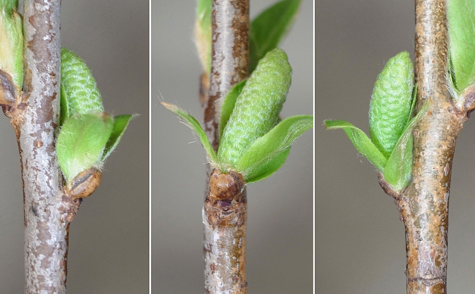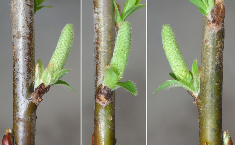 倒れたエゾヤナギの枝で,芽吹き