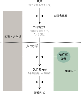 法人化の課題が「中期計画・中期目標」という形で大学に降りてきて,大学が「中期計画・中期目標」のための雑務を盛んにつくり出している現状況は,簡単には,つぎの構造でとらえられる。