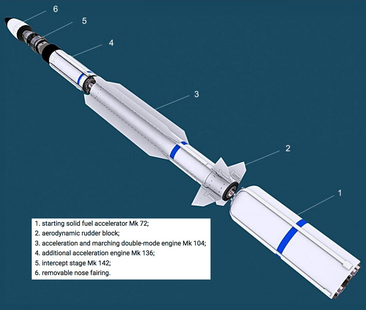 The Mk 142 intercept stage is a self-propelled device with a cryogenic IR-GSN matrix, several processors, a solid fuel propulsion system for maneuvering and orientation (DACS), a power supply and a number of other subsystems on board.