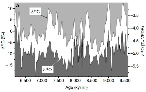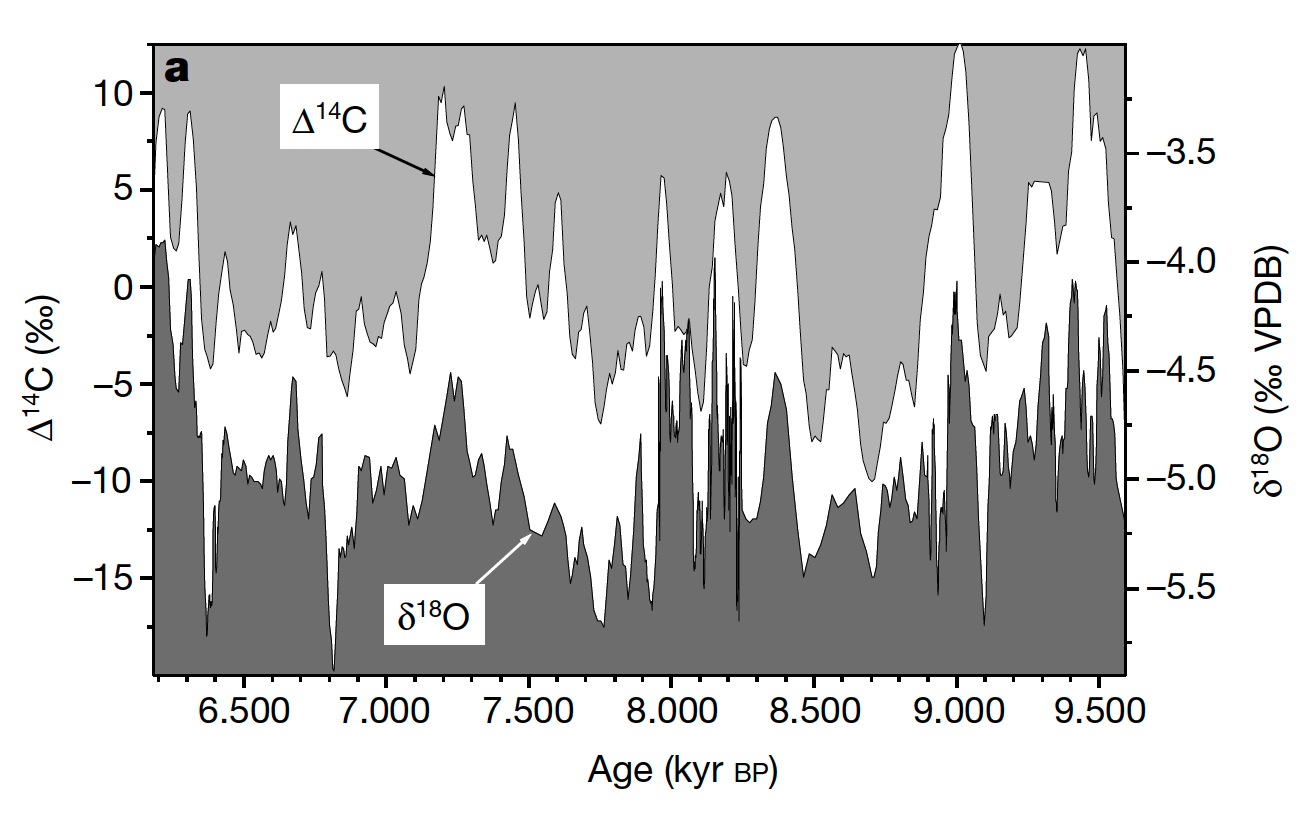 The δ18O record from the stalagmite, which serves as a proxy for variations in the tropical circulation and monsoon rainfall, allows us to make a direct comparison of the δ18O record with the Δ14C record from tree rings, which largely reflects changes in solar activity.