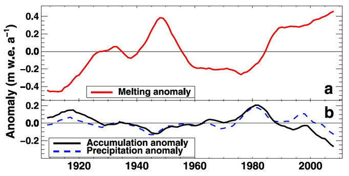 | (b) | annual accumulation and precipitation [降水] anomaly (deviations [偏差] from the 1908–2008 average [平均] ). |