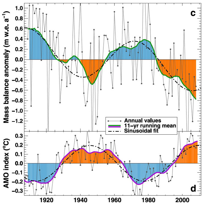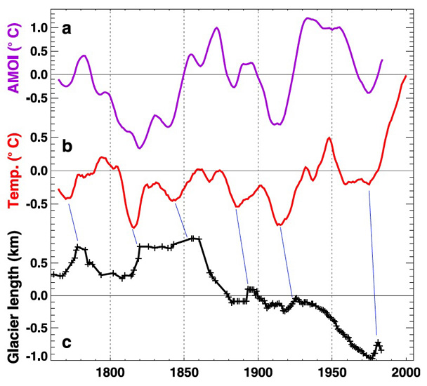 この変動も,様々なフィードバックの複雑な絡み合いの結果である。 そのフィードバックの一つに,大西洋熱塩循環がある ( Huss et al., 2010)。 海氷形成では,氷から排出される塩分によって,海水の塩分濃度が増加する。 北大西洋では,冷却とこの塩分濃度増加によって密度の大きくなった海水が,深部へと沈み込む。 そして, 「熱塩循環 (thermohaline circulation)」として循環する。 この循環は,北大西洋において 50〜70年周期の海水面温度変動パターンを現す (Atlantic multidecadal oscillation, AMO)。 この変動に,様々なフィードバックの絡み合いの結果として,気温変動が連動する。 そしてこの気温変動に,様々なフィードバックの絡み合いの結果として,氷河長変動が連動する: |