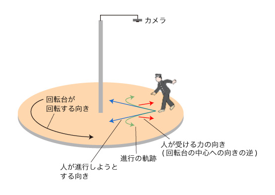 この図では回転台に固定カメラを設置しているが,これは気象学が「コリオリ力」について唱えるもう一つの嘘「見かけの力」を却けるためである。 気象学は,学校教育で「コリオリ力」を 教える側は「知らぬが仏」というわけだが,権威を笠に着て嘘を教えているわけであり,犯罪的であることに変わりはない。 ここであなたは,つぎのように思ったかも知れない: