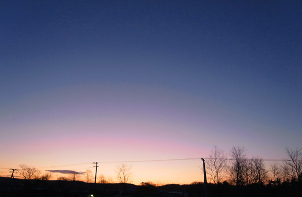 まだ地平線下の太陽から,光が雲や空中の微粒子に反射して目に届く。