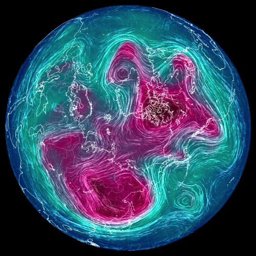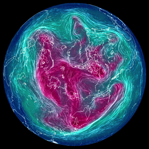 実際,上昇気流と下降気流が束になったこの鉛直対流は,冬は盛んになって低緯度側に拡がり,夏は衰えて高緯度側に後退する。 これを,2022年の 500 hPa 面天気図 (12 UTC) で見ていく。 天気図は,つぎのウェブサイトからダウンロードし,画像編集した: